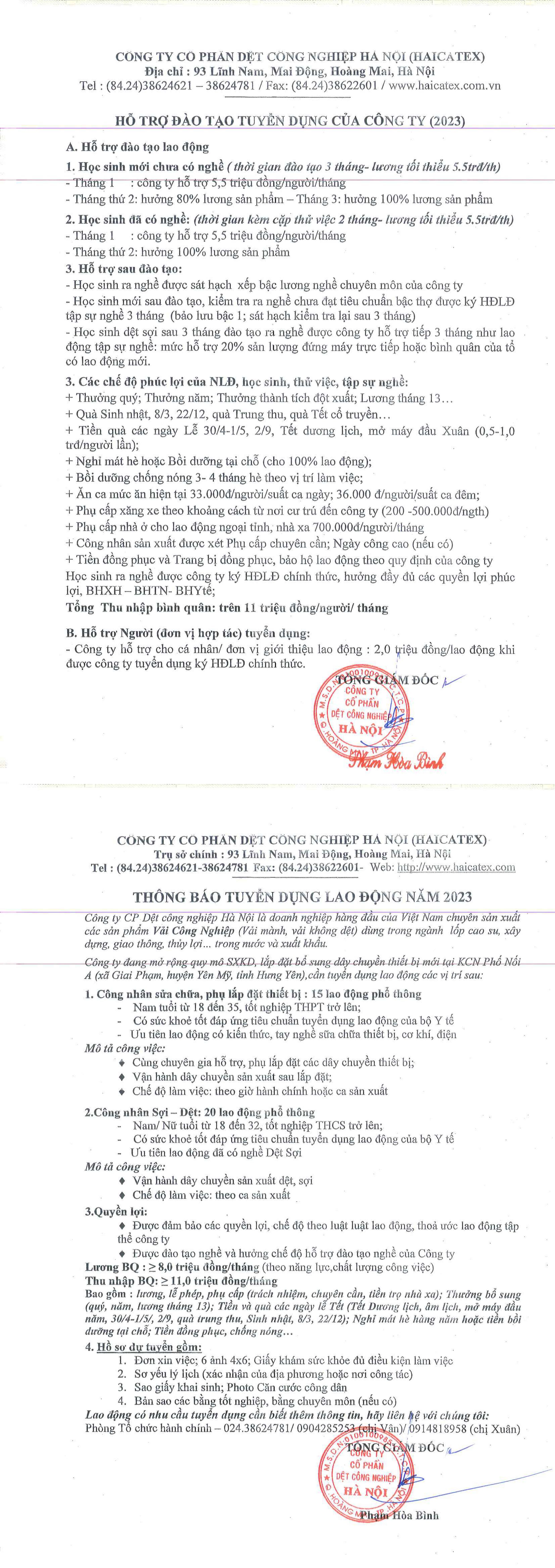 Công ty Cổ phần Dệt Công nghiệp Hà Nội là doanh nghiệp hàng đầu của Việt Nam chuyên sản xuất các sản phẩm Vải Công nghiệp ( Vải Mành, Vải không dệt) dùng trong nghành lốp cao su, xây dựng, thủy lợi... trong nước và xuất khẩu. Công ty hiện đang mở rộng quy mô SXKD. lắp đặt bổ sung dây chuyền thiết bị mới tại KCN Phố Nối A ( xã Giai Phạm, huyện Yên Mỹ, tỉnh Hưng Yên), cần tuyển dụng lao động ở các vị trí sau: 1. Công nhân sửa chữa, phụ lắp thiết bị: 15 lao động phổ thông 2. Công nhân Sợi -Dệt: 20 lao động phổ thông. Các thông tin cụ thể, chi tiết về: Quyền lợi, Lương thưởng, Hỗ trợ đào tạo, các chế độ phúc lợi của Người lao động, học sinh, thử việc, tập sự nghề và Hồ sơ dự tuyển có thể tìm hiểu thêm ở đường link sau: /datafiles/files/TBTD.jpg